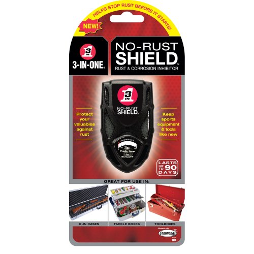 3-IN-ONE No-Rust Shield Rust & Corrosion Inhibitor protects your valuables. It emits Vapor Phase Corrosion Inhibitors (VpCI) that form an invisible layer that seals metals from air and moisture. Perfect for use in tool boxes, tackle boxes, gun cases, silverware storage and in other storage areas. Protects for up to 90 days! It has a unique time guage that indicates when it's time to replace. it contains a 3M Command Strip for easy mounting and removal.